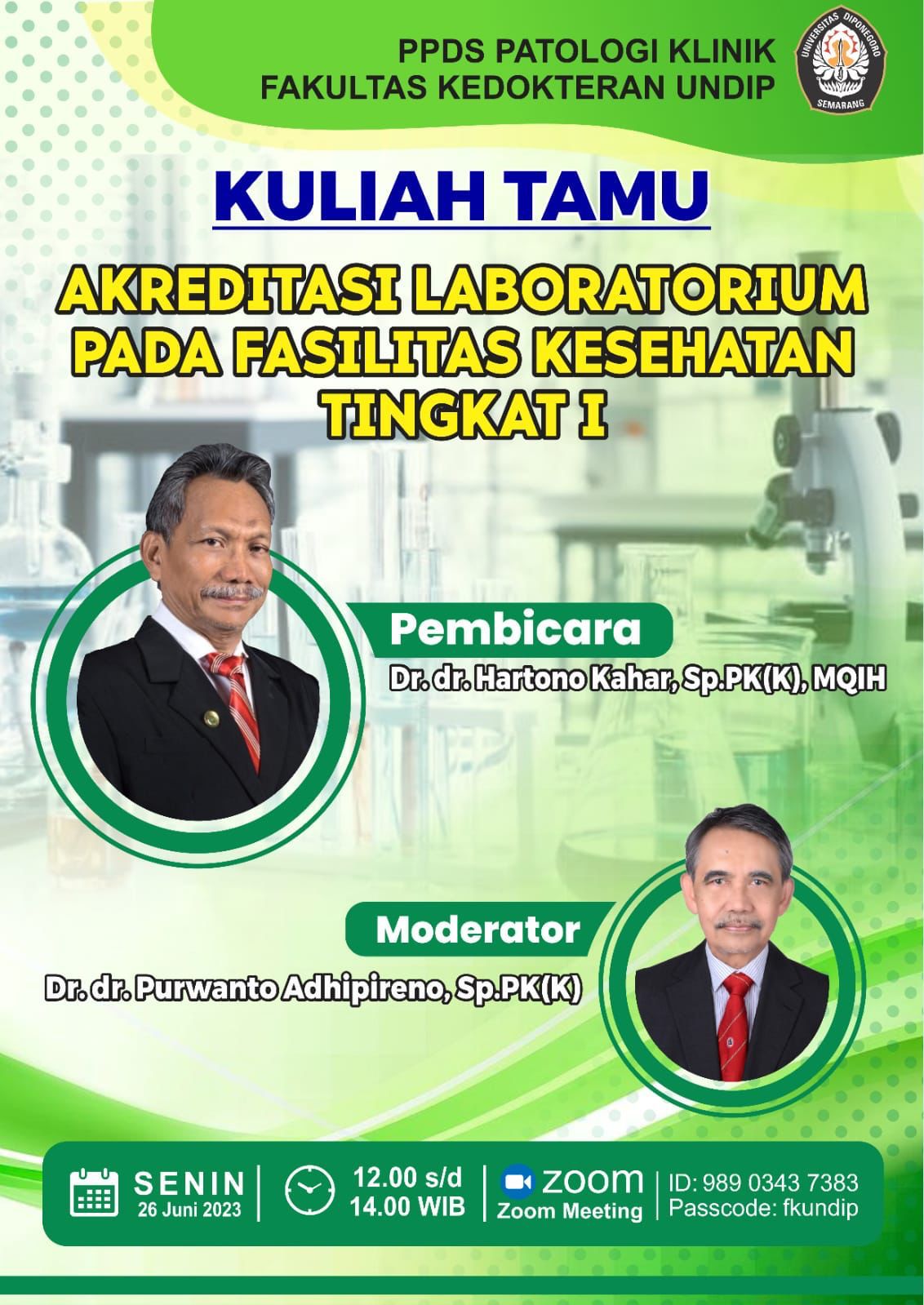 On June 26 2023, the Clinical Pathology Study Program held an online guest lecture with speakers from Airlangga University, Surabaya, namely Dr. dr. Hartono Kahar, Sp.PK (K), MQIH. This guest lecture raised the theme “Laboratory Accreditation at Level I Health Facilities”. This theme was taken in accordance with the sources, namely Dr. dr. Hartono Kahar, Sp.PK (K), MQIH as Head. Laboratory Installation at RSUD Dr. Sutomo Surabaya.