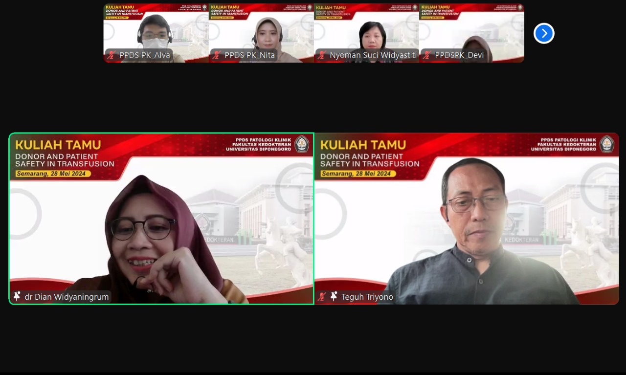 On May 28, 2024, the Clinical Pathology Study Program, Faculty of Medicine, Diponegoro University held a Guest Lecture with the theme “Donor and Patient Safety in Transfusion”. This event was held online and attended by students of the Clinical Pathology Specialist Education Program. The main resource person on this occasion was Dr. dr. Teguh Triyono, M.Kes, Sp.PK., Subsp.B.D.K.T (K), Subsp.K.V. (K) from the Faculty of Medicine, Universitas Gadjah Mada, a consultant specialist in the field of Blood Bank and Transfusion Medicine and serves as Vice Chairman I of PDS PatKLin Central Board.