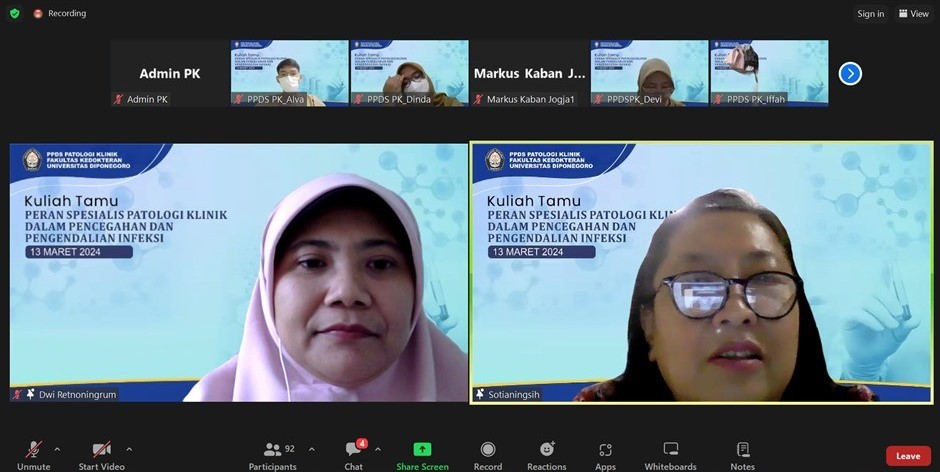 Pada tanggal 13 Maret 2024, Program Studi Patologi Klinik (Prodi PK) mengadakan kegiatan kuliah tamu (kultam) bertajuk “Peran Spesialis Patologi Klinik dalam Pencegahan dan Pengendalian Infeksi”. Kegiatan ini diselenggarakan secara daring melalui platform Zoom Meeting, memfasilitasi partisipasi dari seluruh peserta yang tergabung dalam Program Pendidikan Dokter Spesialis Patologi Klinik Fakultas Kedokteran Universitas Diponegoro.