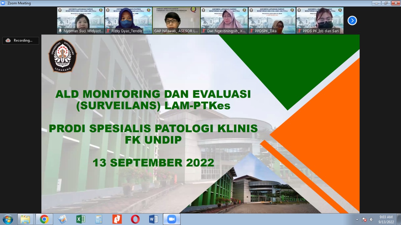 Sebagai tahapan dari Akreditasi, LAM-PTKes melakukan pemantauan dan evaluasi (Surveilans) terhadap pemenuhan syarat status akreditasi dan peringkat terakreditasi Prodi Patologi Klinis FK Undip. Kegiatan ini dilaksanakan pada tanggal 13 September 2022 secara daring, dipimpin oleh Asesor Gst Ayu Putu Nilawati, Dr, Sp. A (K), MARS.